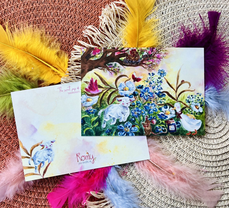 Lammetjes tussen de Bloemen ansichtkaartWie wilt er nu niet zo'n ontzettend vrolijk kaartje in de bus!